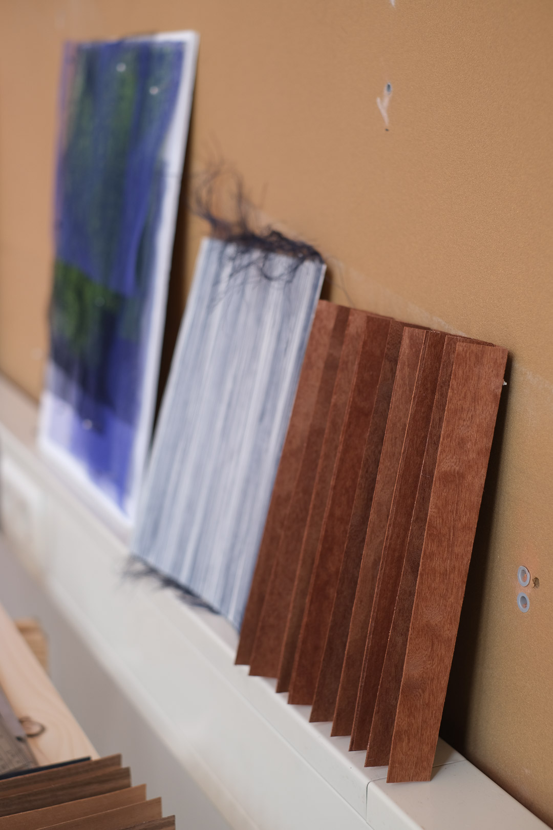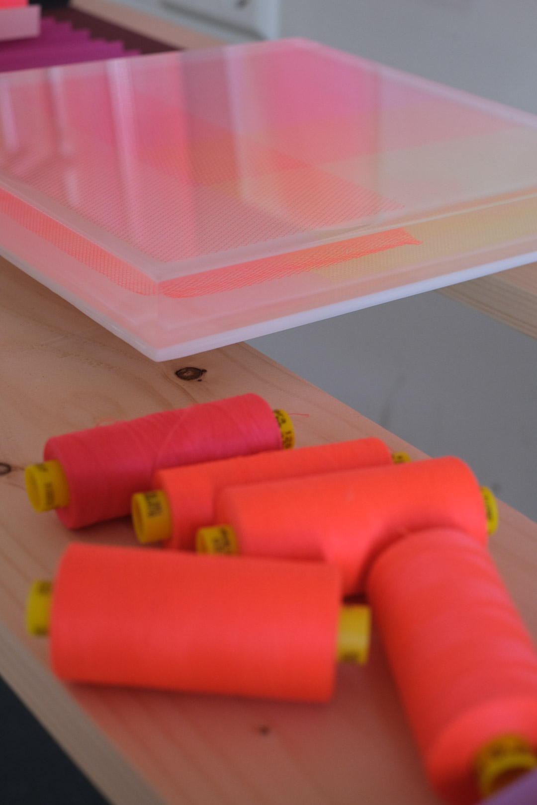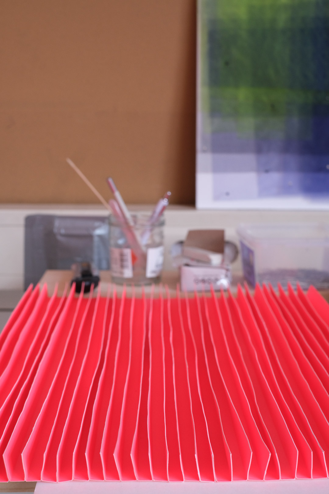 Naast tule werkt ze – onder de naam Rhythm – ook graag met handgeschept katoenen papier en zacht, handzaam fineer. Door deze in stroken te snijden, te vouwen en aan elkaar te bevestigen ontstaat er een fraai lijnenspel en diepte. Ze vindt het een feestje om steeds weer andere materialen uit te proberen, zo maakte ze een variant met knalroze griptape (je weet wel, wat je op een skateboard plakt) en notenhout. Ze stelt zichzelf vragen als ‘hoe laat ik de tekening van het hout doorlopen?’ en daagt zichzelf hiermee uit steeds nieuwe dingen te ontdekken.