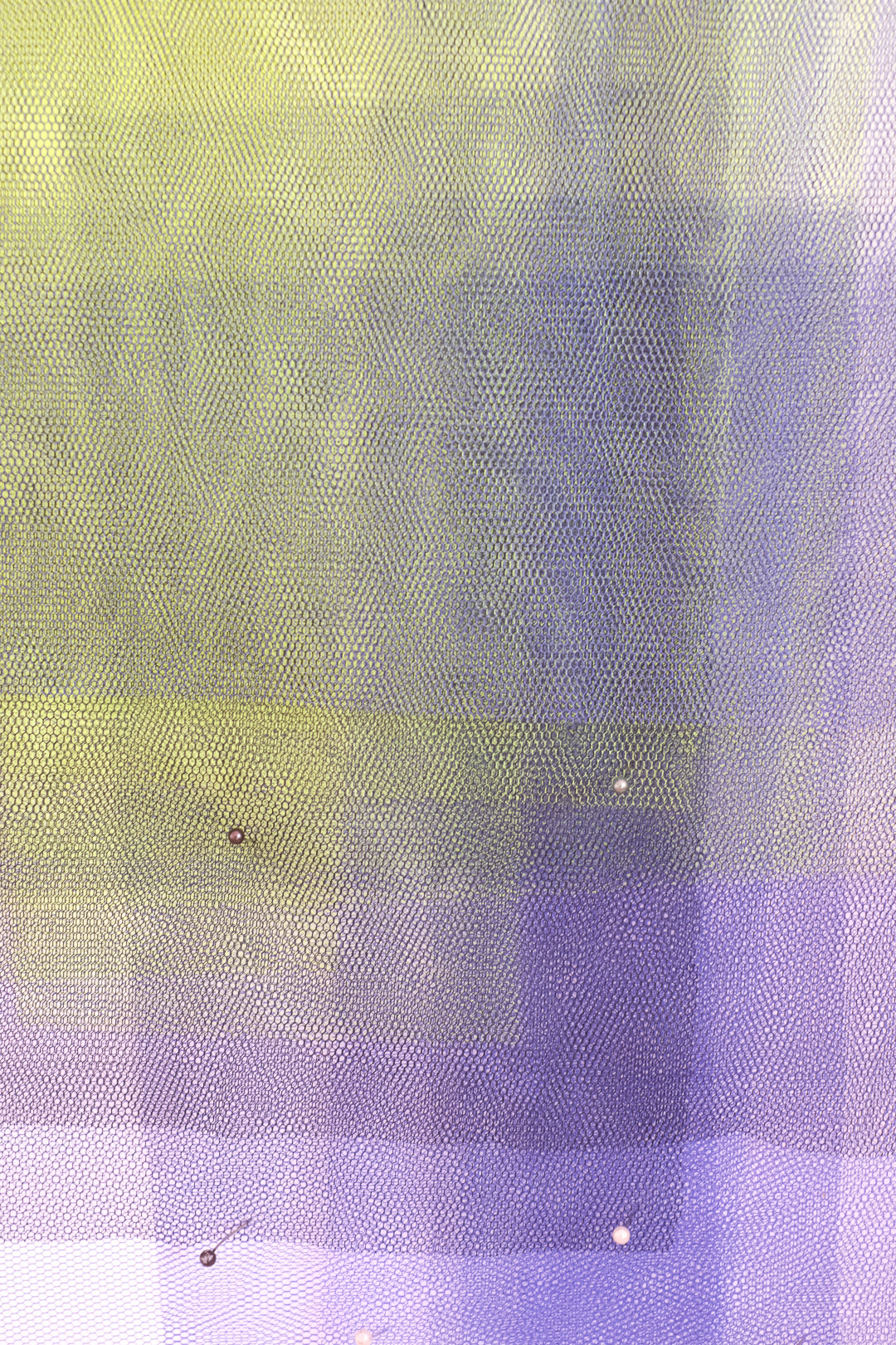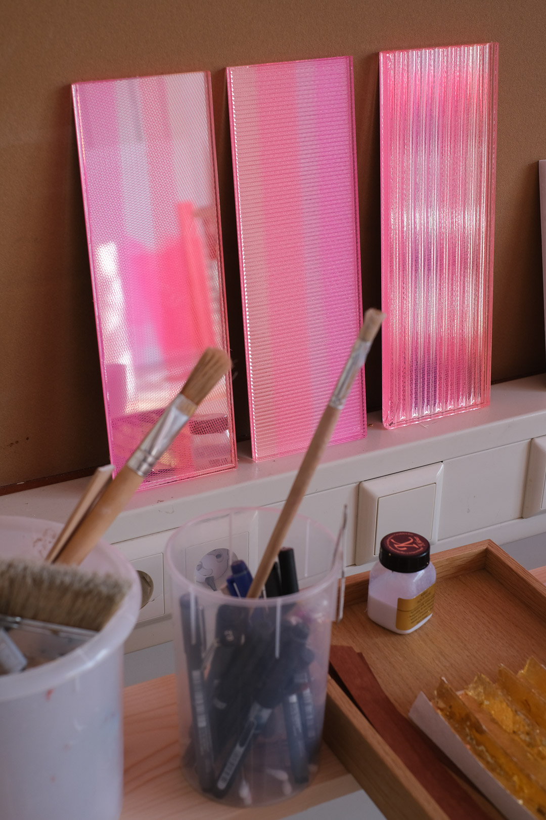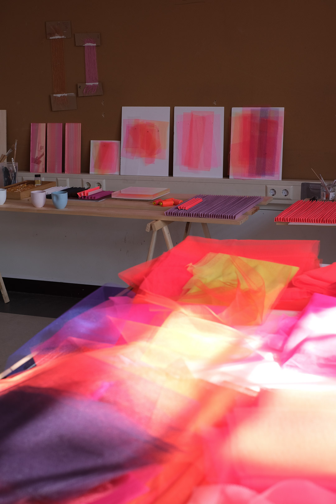 Haar werk kenmerkt zich in de eerste plaats door kleur en wel onze lievelingskleur roze, in vele nuances. Ze nam ons mee in haar proces en vertelde voluit over hoe ze een werk opbouwt uit diverse laagjes tule in verschillende kleuren, die er voor zorgen dat er een bepaalde gelaagdheid ontstaat. Zo maakt wit het roze zachter en oranje het roze nóg intenser. Ze bestudeert nauwkeurig hoe de kleuren en het materiaal (glanzend, mat, fijnmazig en grofmazig tule) elkaar beïnvloeden. Als de juiste compositie is ontstaan wordt het werk in epoxy gegoten.