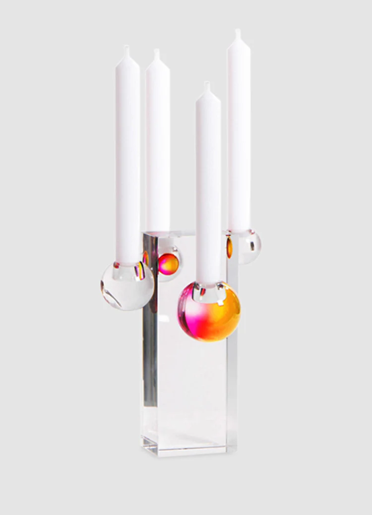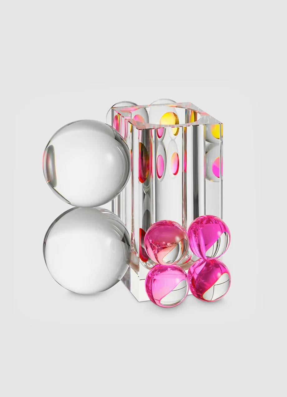 Vier kristallen bollen rusten op een massief kristalblok. Met een speciaal gepigmenteerde verbinding ontstaat een subtiel tie-dye effect dat het licht op een verrassende manier vangt en weerkaatst.
