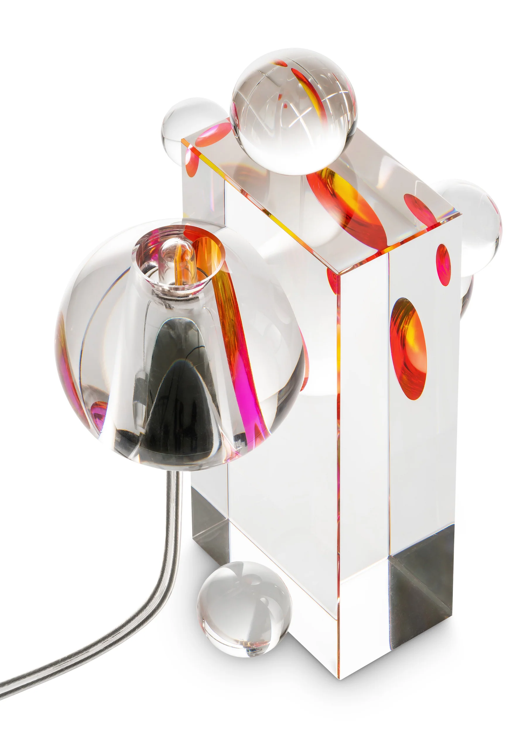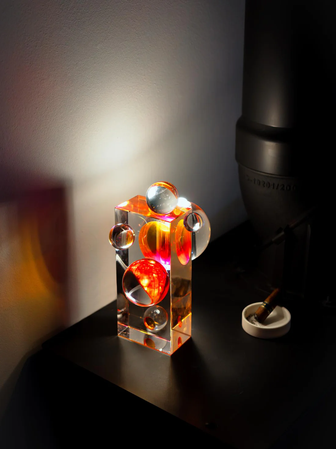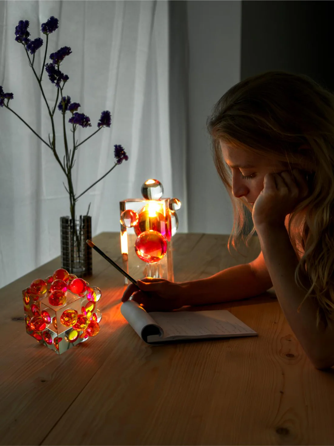 Een betoverend en uniek object, met de hand vervaardigd uit duurzaam loodkristal. De gepolijste kristalbollen verspreiden het licht op een sfeervolle manier, versterkt door onze innovatieve gepigmenteerde verbinding die subtiel kleur en glans toevoegt.
