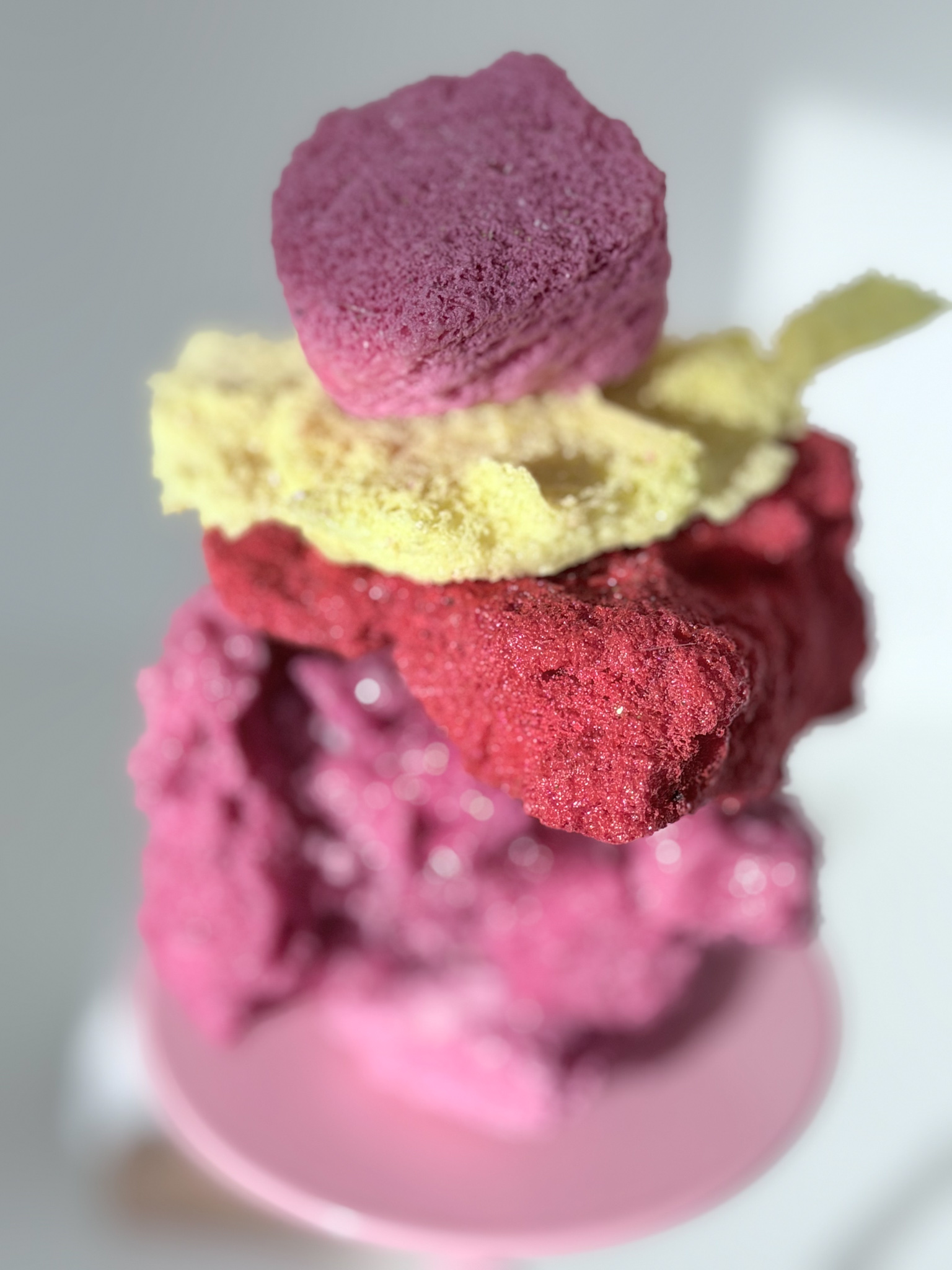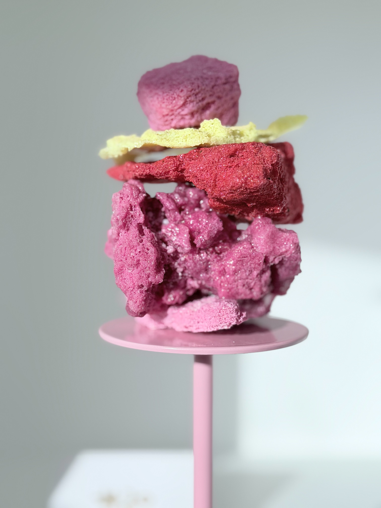 De Stacked Sugar Rocks worden op een verhoogd, roze plateau geleverd. De sculpture is niet permanent bevestigd op het plateau, je kan het dus mét en los van het plateau stylen!